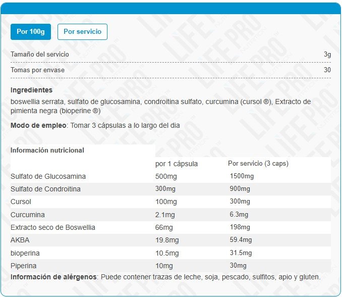 Entre ellos, encontramos condroitina y glucosamina, que refuerzan el cartílago, pimienta negra Bioperine, que favorece la absorción de los nutrientes, y otros como la curcumina, procedente de la cúrcuma, con poder antiinflamatorio y boswellia serrata.