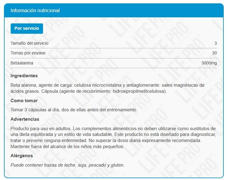 La Beta Alanina de Life Pro es un nuevo suplemento que aporta, Beta Alanina, un aminoácido no esencial, es decir que nuestro organismo produce en ciertos niveles por si mismo, que se sintetiza en el hígado y lleva a cabo funciones relacionadas directamente con la síntesis de carnosina.