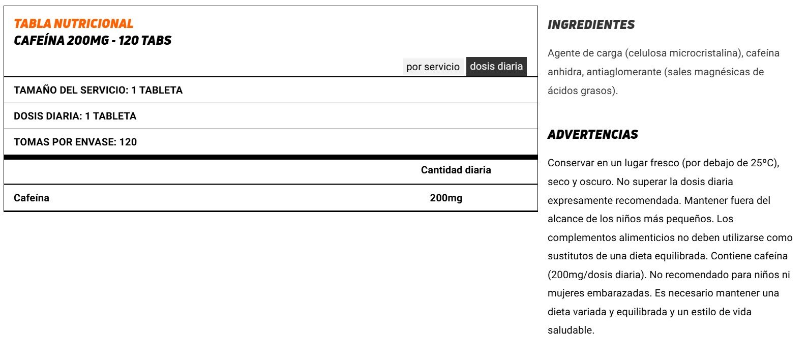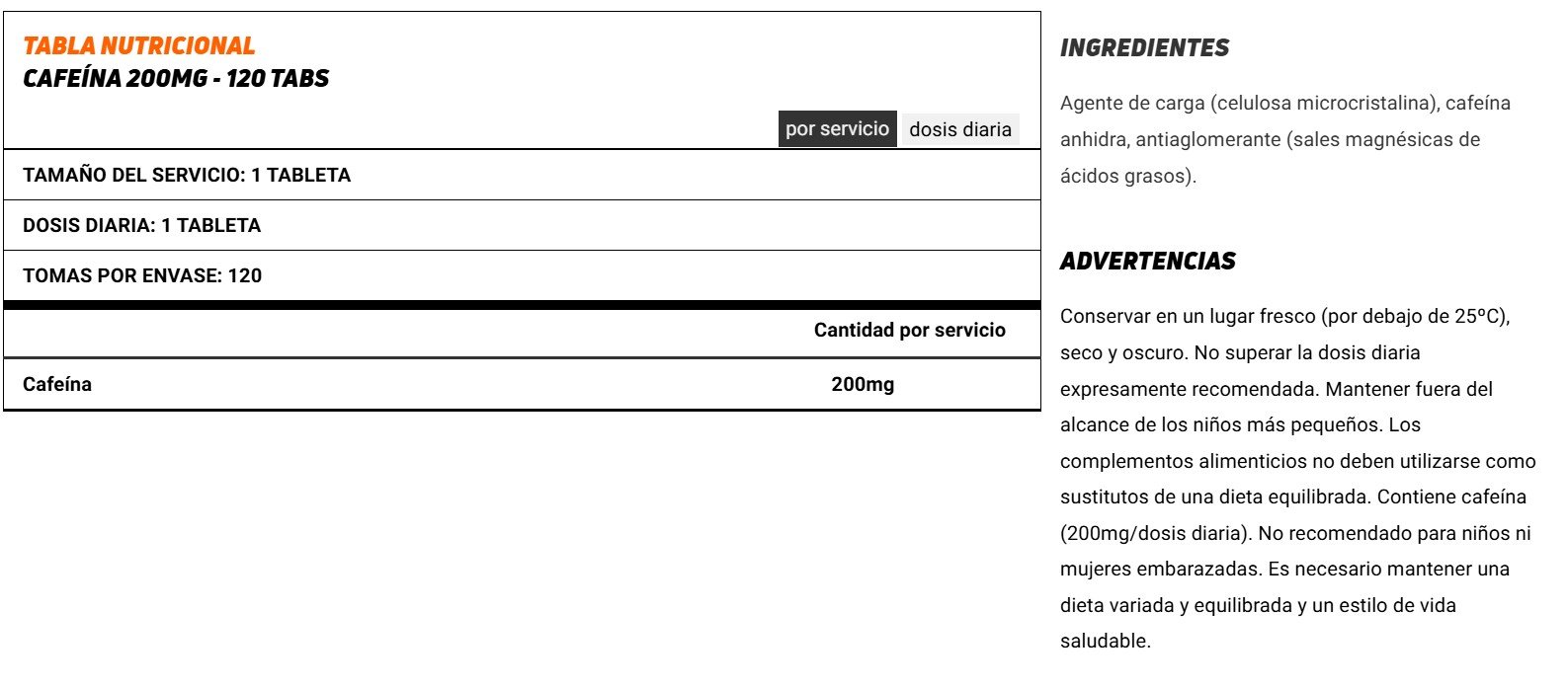 - Cafeína anhidra en tabletas de alta concentración: 200mg por unidad.