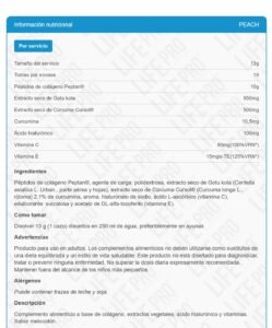 Antiaging Collagen Peptides contiene péptidos de colágeno, extractos de plantas, ácido hialurónico, vitaminas, minerales y edulcorante.