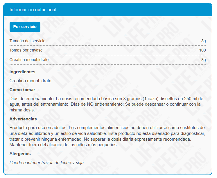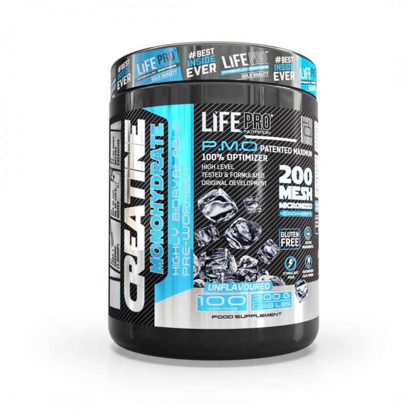 Life Pro Creatine Monohydrate 300g es un suplemento a base de Creatina Monohidrato, micronizada, con sabor neutro, en un nuevo formato de 300g.
