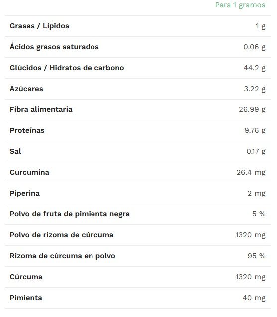 Rizoma de cúrcuma (curcuma longa L.) en polvo (95%), Fruto pimienta negra (piper nigrum) en polvo (5%).
