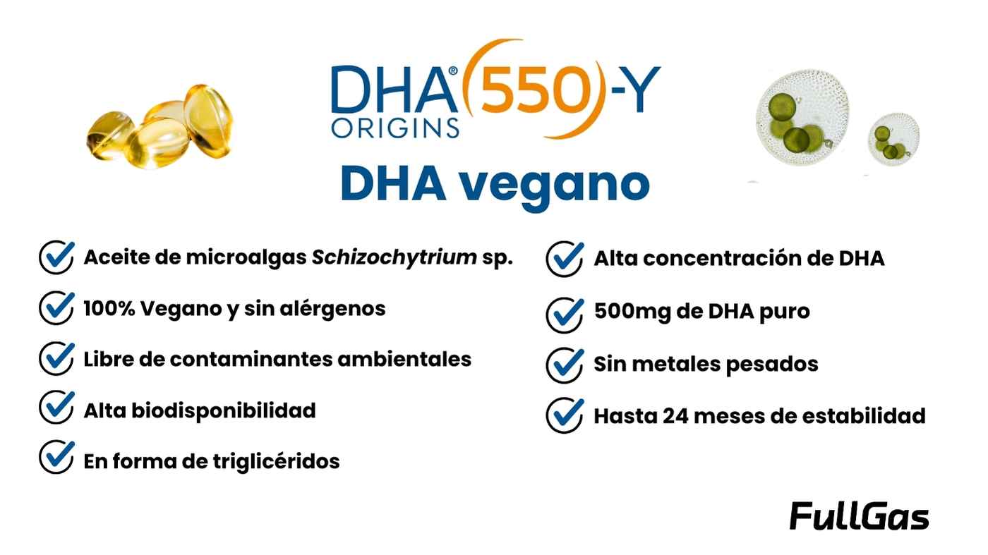 Vegan DHA es un complemento alimenticio a base de DHA (ácido docosahexaenoico), un ácido graso omega-3 esencial obtenido de microalgas Schizochytrium sp. (FCC-3204) con materia prima DHA ORIGINS® 550-Y.