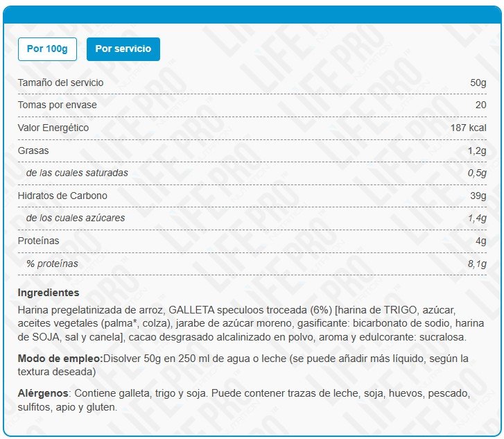 La crema de arroz pregelatinizada se caracteriza por ser un alimento muy versátil de usar, fácil de preparar y además, es muy saciante.  Es una fuente de hidratos de carbono de rápida absorción; aportan energía de forma rápida en el tiempo. Además, es rico en fibra.
