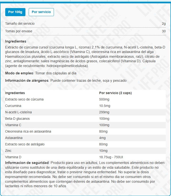 - Reducción del estrés oxidativo mediante potentes antioxidantes como la curcumina y la astaxantina.