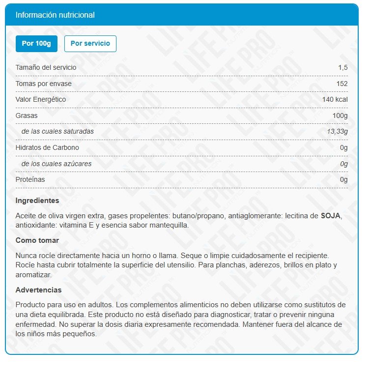 LIFE PRO FIT-FOOD ACEITE DE OLIVA SABOR A MANTEQUILLA 250 ML. es Aceite de Oliva Virgen Extra 100%, prensado en frío y acidez máxima 0,3º