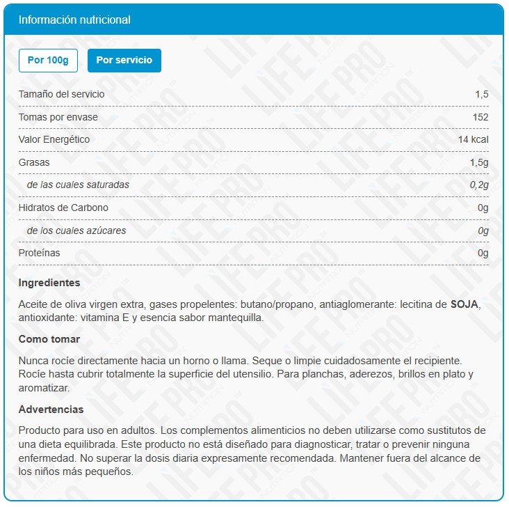 LIFE PRO FIT-FOOD sabor a MANTEQUILLA viene en un cómo envase en aerosol que evita malgastar ni una sóla gota de aceite y una aplicación limpia y precisa.