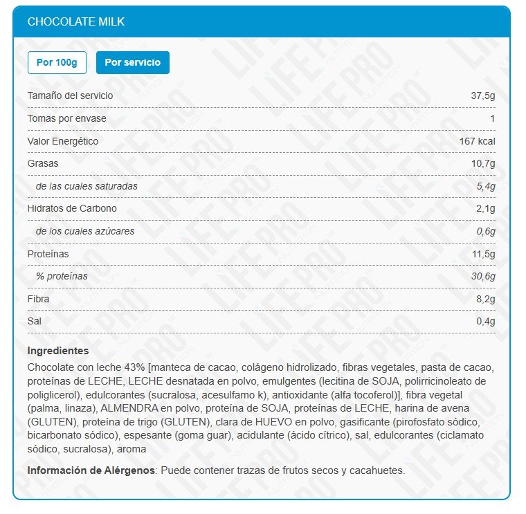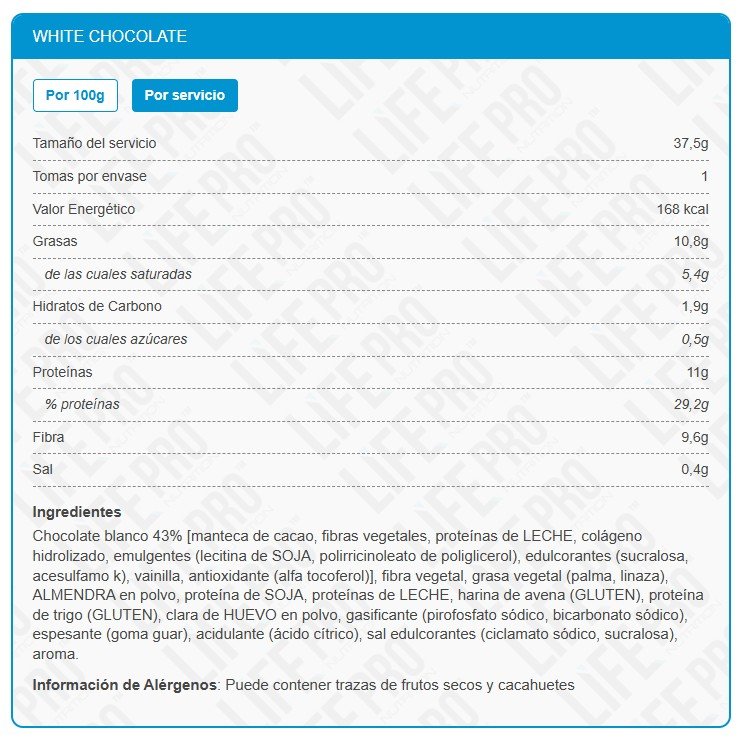 Alto contenido en proteína: Entre 29,2% y 30,6% de proteína. Cada paquete de 37,5 g de Life Pro Creations contiene 11 gramos de proteína.