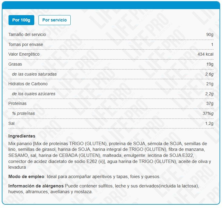 Life Pro Fit Food Toasted Protein Bread ha sido elaborado con un mix de proteínas que incluye proteína de soja y de trigo, en conjunto con diferentes tipos de harina, destacando la harina integral de trigo. Además, ha sido enriquecido con semillas de sésamo, lino y girasol.