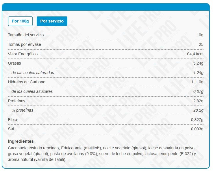-Es una crema de cacahuetes con alto contenido en proteína. Cada 100 gramos de crema de avellanas, contiene 28 gramos de proteína.