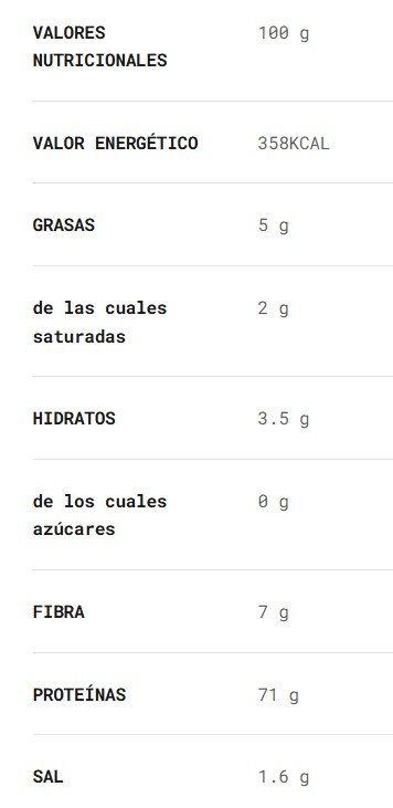 Alta concentración proteica: Proporciona 71 g de proteína por cada 100 g de producto, favoreciendo el desarrollo y mantenimiento de la masa muscular.