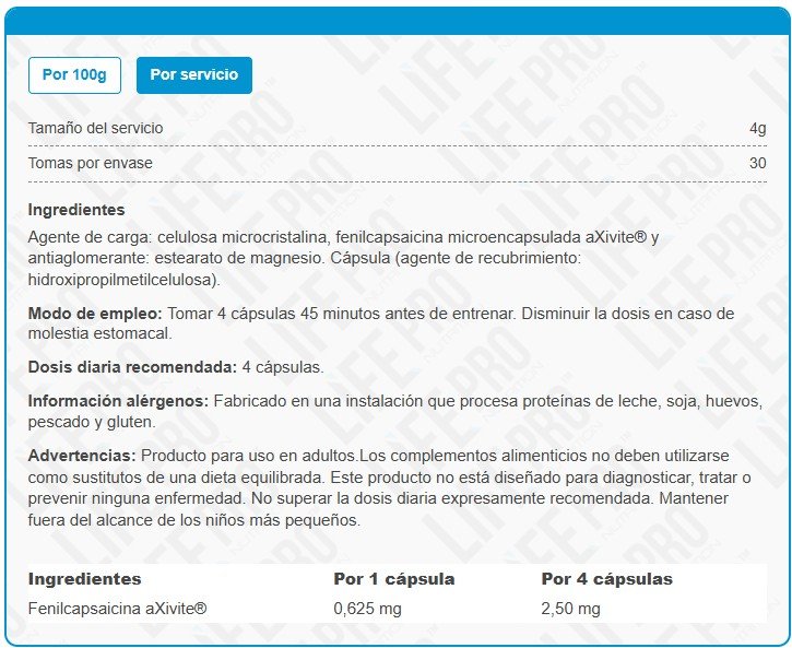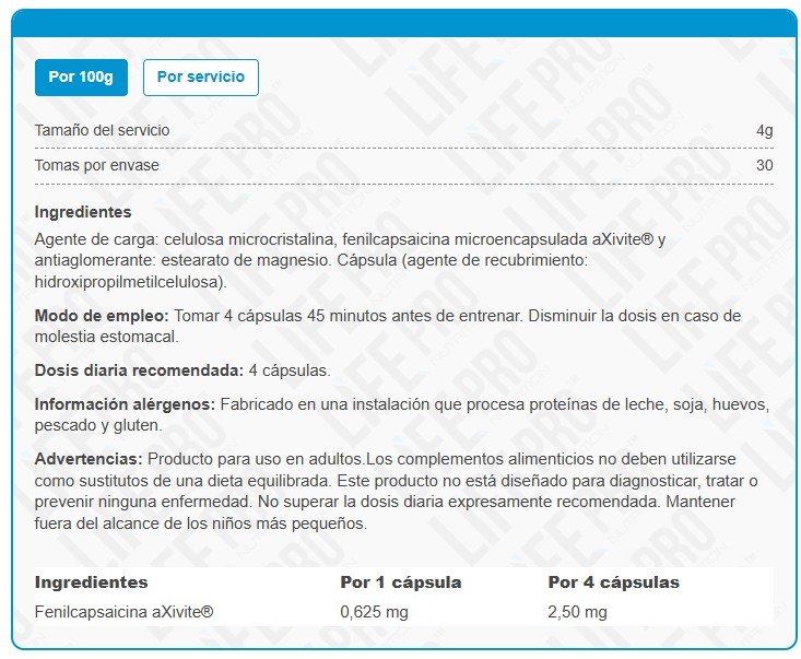 Fenilcapsaicina Life Pro es un suplemento con efecto termogénico, que ayuda a la mejora del rendimiento y actúa como analgésico. Ha sido formulado con Capsaicina aXivite.