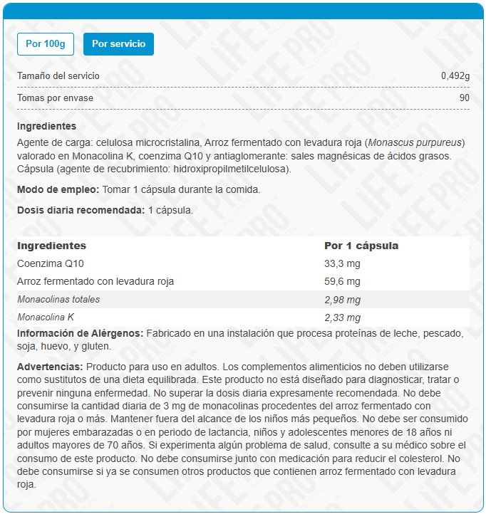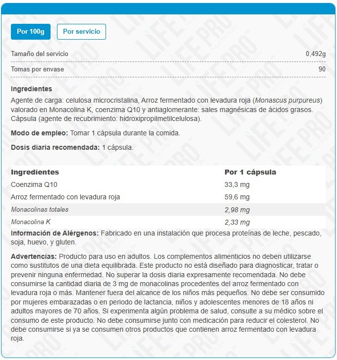 Advertencias: Producto para uso en adultos. Los complementos alimenticios no deben utilizarse como sustitutos de una dieta equilibrada. Este producto no está diseñado para diagnosticar, tratar o prevenir ninguna enfermedad. No superar la dosis diaria expresamente recomendada. No debe superarse la dosis diaria de menos de 3 mg de monacolinas. Mantener fuera del alcance de los niños más pequeños. No debe ser consumido por mujeres embarazadas o lactantes, niños y adolescentes menores de 18 años ni adultos mayores de 70 años.