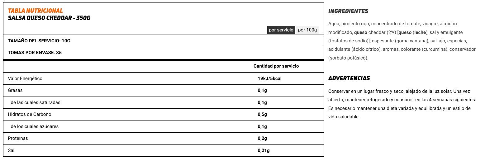Deliciosa salsa de Cheddar elaborada con auténtico queso. Receta tradicional americana, versión HSN – Saludable y apta para todo tipo de dietas. Elaborada con ingredientes de calidad y especias naturales. Consistencia densa, combina con todo tipo de recetas. Baja en azúcares y grasas. ¡Solo 5kcal por porción!