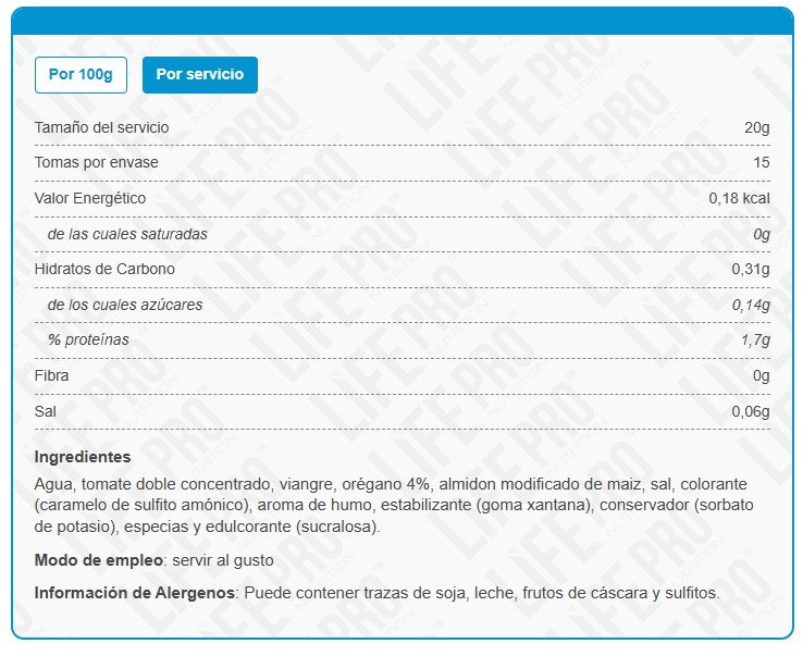 Añade 1 ración de la salsa por porción (20 gramos) a tus platos y recetas. Recomendada para la preparación de pastas, pizzas, carnes, y verduras.