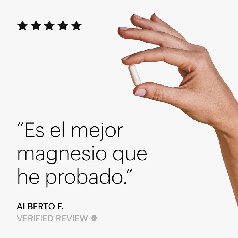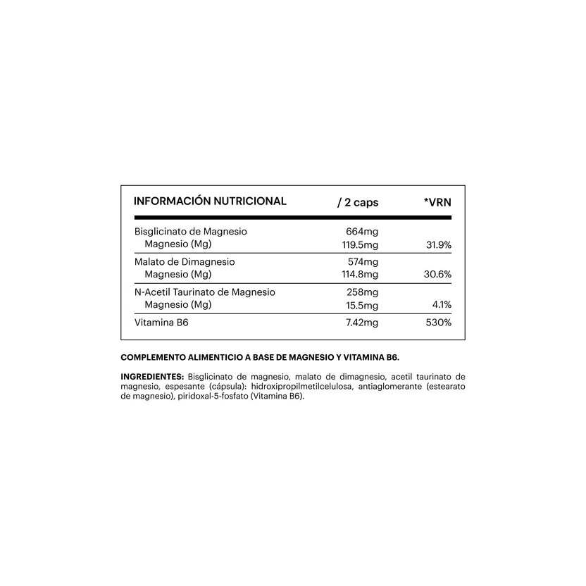 Ingredientes*: Bisglicinato de magnesio, malato de magnesio, acetil taurinato de magnesio, espesante (cápsula): hidroxipropilmetilcelulosa, antiaglomerante (estearato de magnesio), piridoxal-5-fosfato (Vitamina B6).